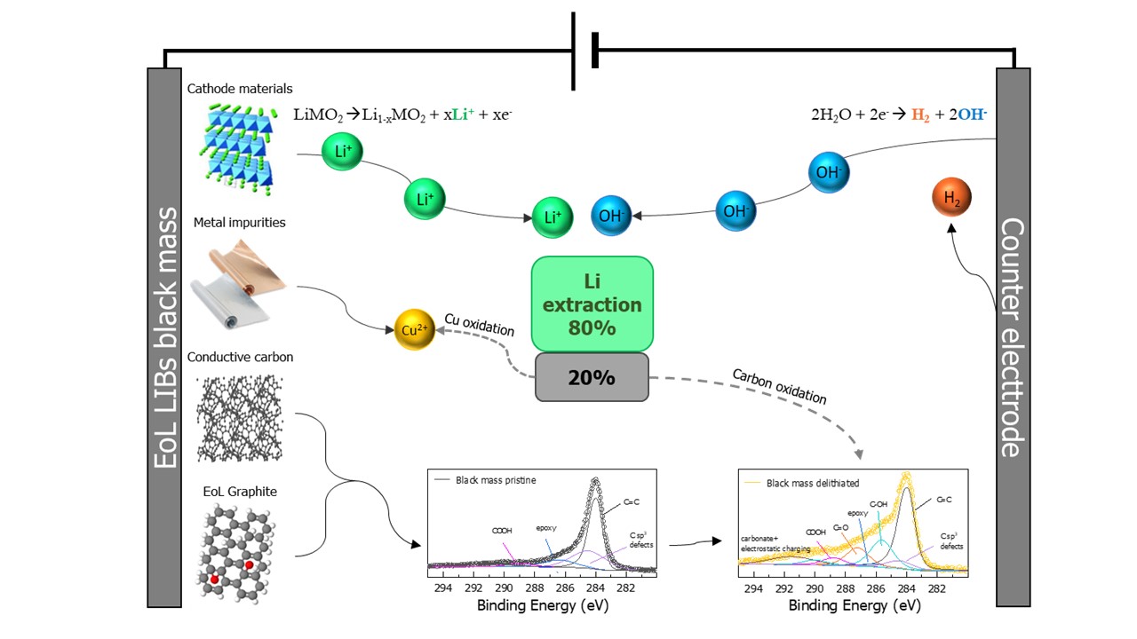 Current recycling processes lack selectivity in recovery control and require significant consumption of reagents and energy. The research conducted by the RHINOCEROS partners at Sapienza University of Rome (UoS), Department of Chemistry, aims to develop an electrochemical process for selective extraction of Li from electrodic powder of end-of-life (EoL) LIBs. This concept simulates the charging process of a LIB with an aqueous electrolyte and a cathode material (counter electrode) that facilitates water reduction. The hydroxyls freed by water reduction and the Li + cations deintercalated by the anode will form a LiOH solution.