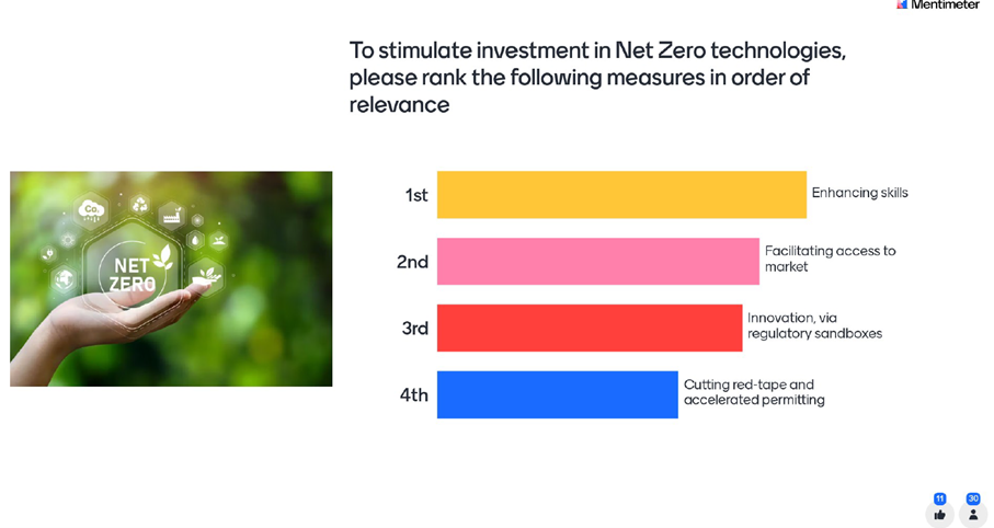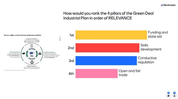 Over 30 persons participated in the live-poll proposed, which results display the priority to be set on funding and state aid regarding ranking the four pillars of the Green Deal Industrial Plan in order of relevance (followed by skills development, conductive regulation, and open and fair trade). Another major topic regarding the stimulation of investment in net Zero technologies, the majority of answers placed the ‘enhanced skills’ as first priority, shortly followed by facilitating the access to the market.